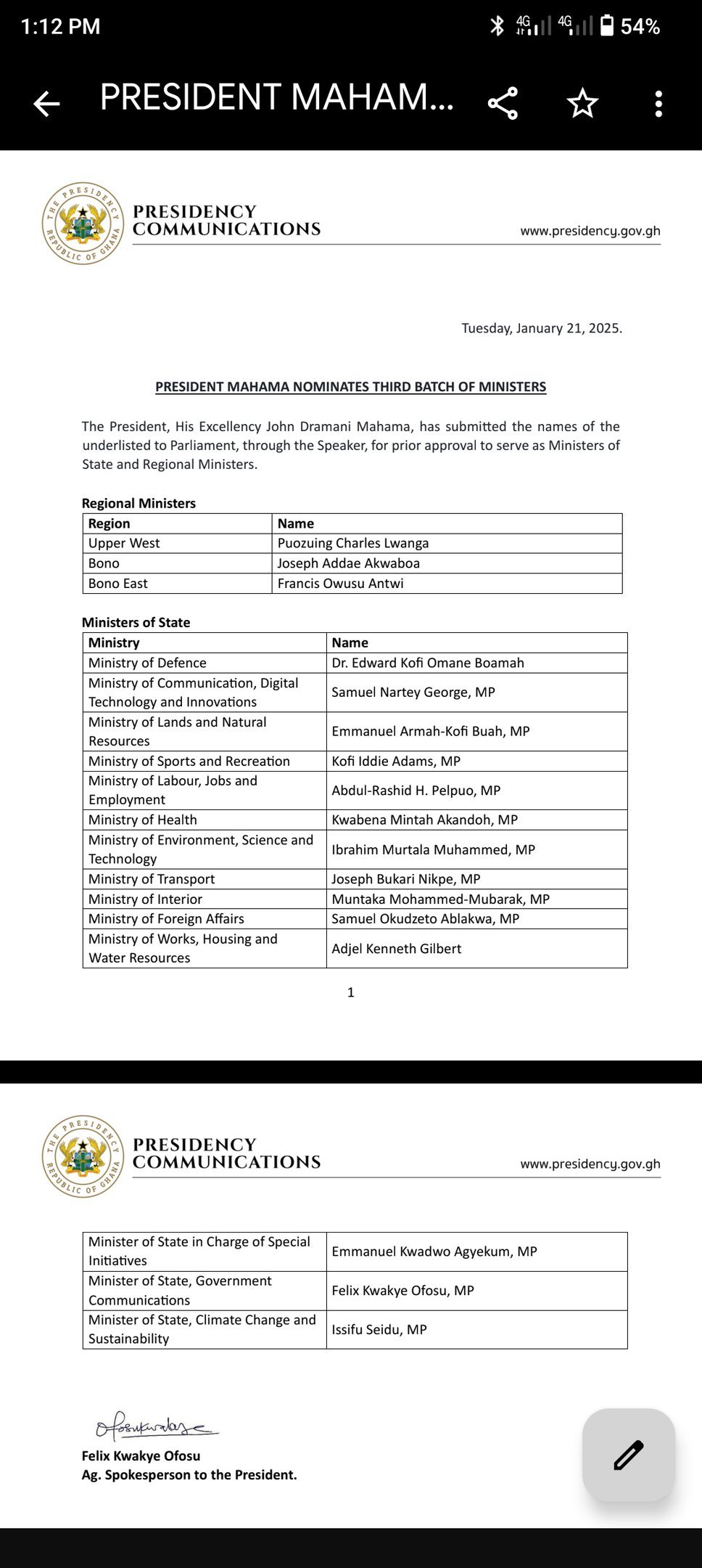 On January 21, 2025, His Excellency John Dramani Mahama, President of Ghana, submitted a new list of ministerial nominees to Parliament through the Speaker for prior approval. This third batch of appointments reflects the government’s continued commitment to effective governance and equitable regional representation.